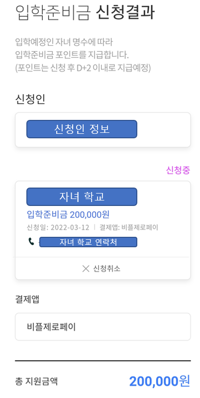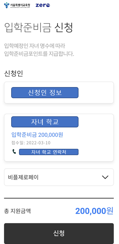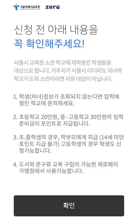 대상 (1인당) : 초등 20만원 /중 고등학생 30만원