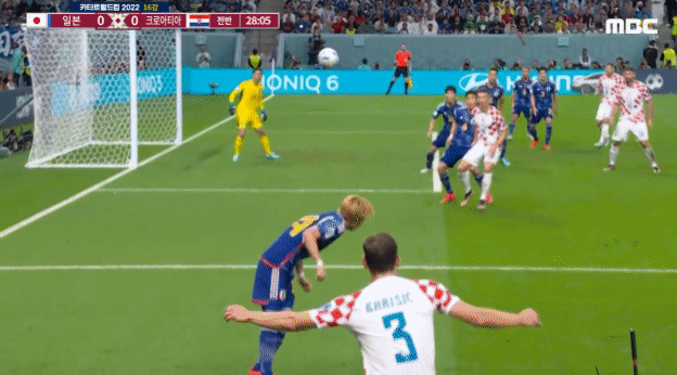 일본 수비 몸 맞고 올라온 공이