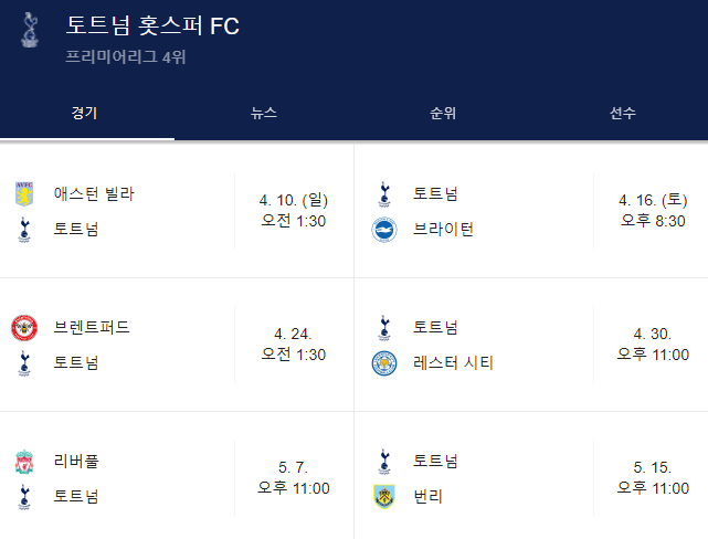 | 토트넘 경기일정 4/4 12:30분 VS 뉴캐슬 중계시간 (손흥민 선발출전 경기) (0) | 2022.03.30 |