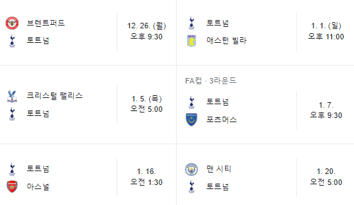 | 토트넘 크리스탈팰리스 경기결과 4-0 케인 멀티골 손흥민 리그 4호골장면 하이라이트 (1) | 2023.01.05 |