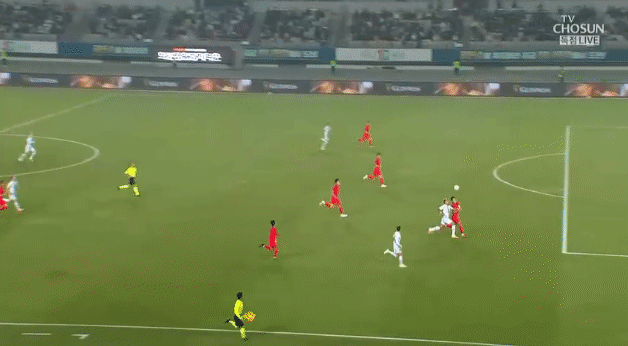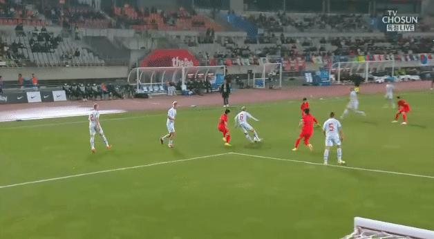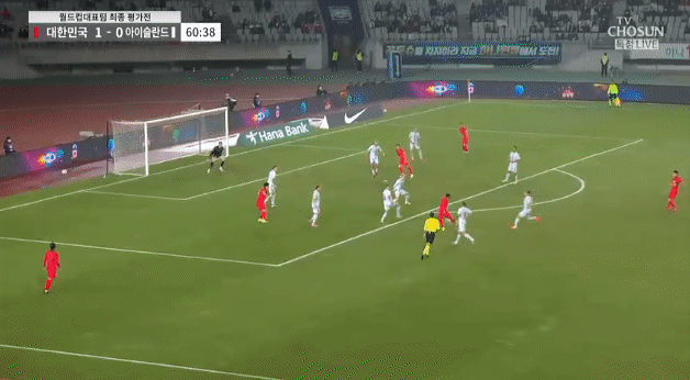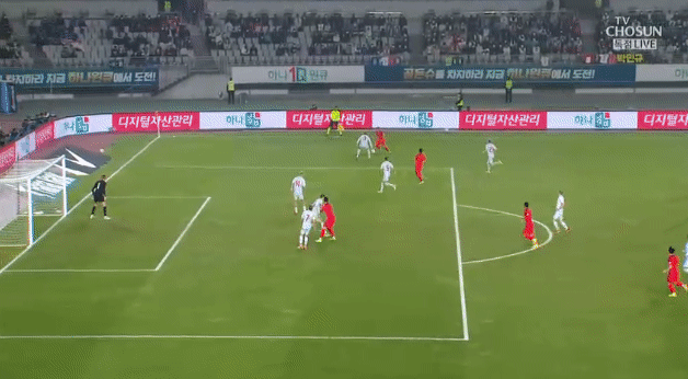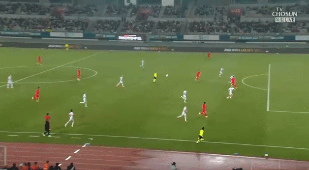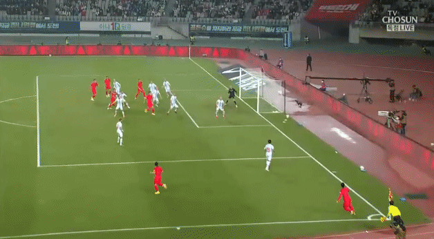 홍철의 크로스를 수비 몸에 맞고 나오는 것을